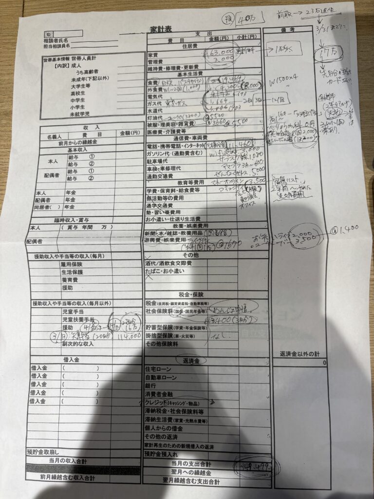電話での予約時点で収入・支出がわかる書類等を持ってくるように言われていたため、クレジットカードや銀行口座を連携したMoneyForwardというアプリを見せることに決めていました。このアプリに収入・支出があらかた記録されていたため、これをもとに相談員さんが家計表に項目ごとに記入していきました。その写真が以下のものになります。