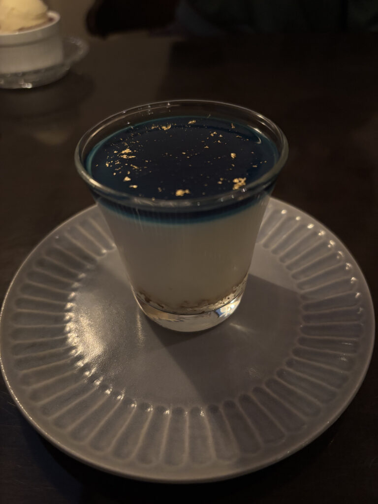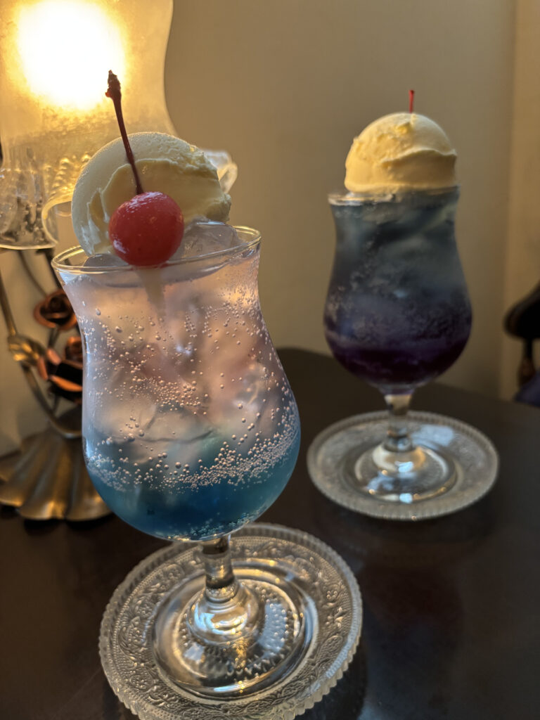 これですこれ。メロンソーダは朝昼夜の空をモチーフに作られていておしゃれ。チーズケーキも上部分は夜空をモチーフにしていて幻想的。